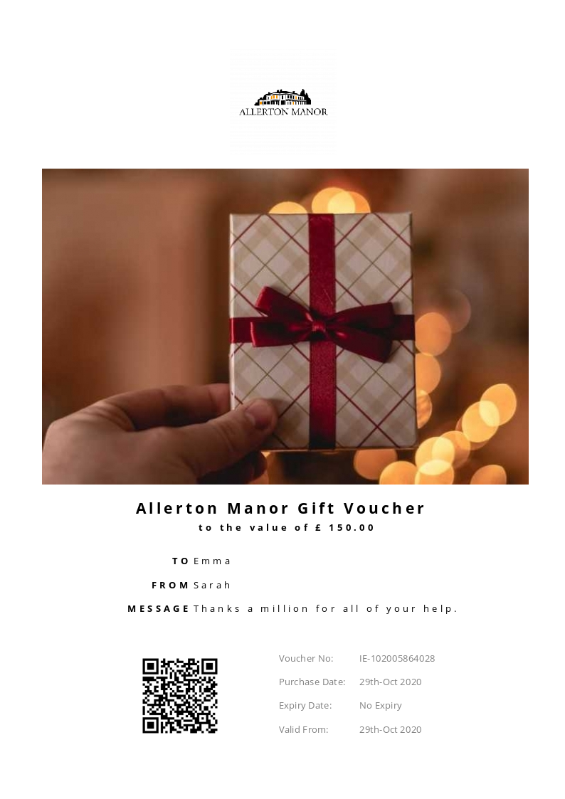 Allerton Manor allows you to purchase instantly printable gift vouchers, special offers and tickets using the Voucher Connect platform.